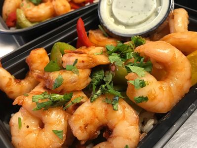 Pictured here: Chipotle Shrimp Bowl with Grilled Peppers, Brown Rice, and Cilantro Cream Sauce.