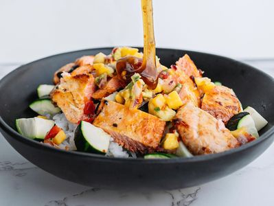 Pictured here: Honey Lime Salmon w/ Avocado Salsa and Jasmine Rice